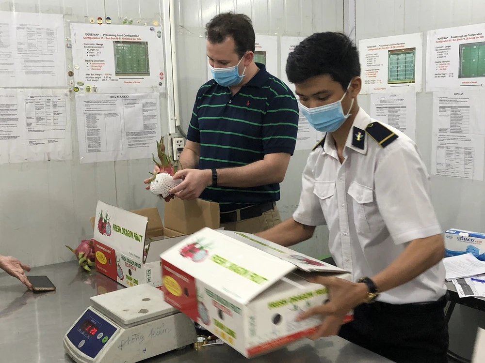 Đóng thùng trái cây xuất khẩu sang Mỹ. Ảnh: Quang Huy