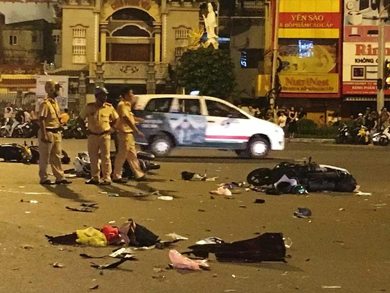 Tối 21-10-2018, bà Nguyễn Thị Nga say rượu lái ô tô BMW tông năm xe máy dừng chờ đèn đỏ và một ô tô ở ngã tư Hàng Xanh, quận Bình Thạnh, tp.hcm làm bảy người thương vong. Ảnh: N.TRÀ