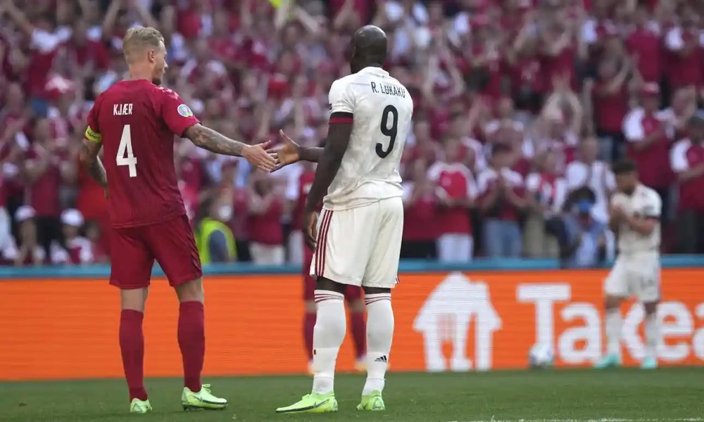 Lukaku chia sẻ với đội trưởng Đan Mạch trên sân Parken sau tai nạn của người bạn thân Eriksen. Ảnh: CGI.
