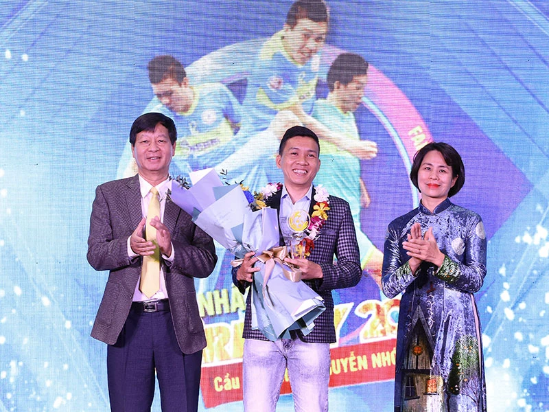 Nguyễn Nhớ chân chất nhận danh hiệu Fair Play 2020 trong sự chúc mừng của ông Lê Khắc Hiệp, Phó Chủ tịch tập đoàn Vingroup (trái) và bà Lê Thị Hoàng Yến, Phó Tổng cục trưởng Tổng cục TDTT. Ảnh: HOÀNG GIANG