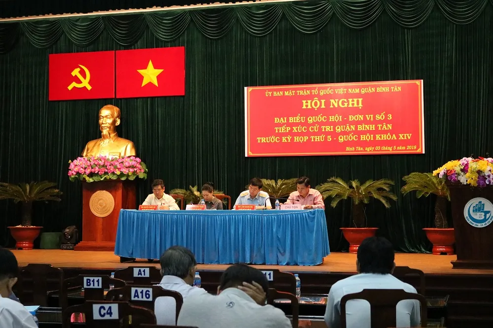 Chiều nay (3-5), cử tri quận Bình Tân đã có buổi trao đổi thẳng thắn với Tổ đại biểu Quốc hội (ĐBQH) số 3 gồm Thiếu tướng Lâm Quang Đại; Phó Giám đốc Sở Tư pháp Phan Thị Bình Thuận và ông Nguyễn Phước Lộc. Đây là buổi làm việc thứ hai trong ngày của Tổ ĐBQH số 3, trước thềm kỳ họp thứ 5, QH khóa XIV.