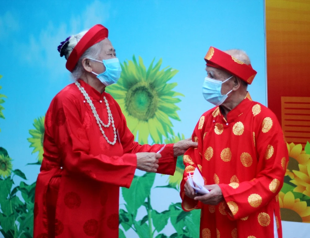 Ông Nguyễn Gia Thế và bà Nguyễn Thị Bích Nụ vận khăn đóng, áo dài hồng điều trong ngày bầu cử. Ảnh: VIẾT THỊNH