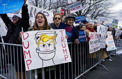 Trong khi đó, giữ khoảng cách hợp lý với nơi diễn thuyết, những người biểu tình chống Trump (ảnh) đưa cao các biểu ngữ “Donald Trump phải ra đi”, “Hãy lật đổ Trump”. Cảnh sát đã được điều động bảo đảm an ninh. Người muốn vào nơi diễn thuyết không được mang theo túi xách và không thể đậu xe cạnh đó mà phải đậu xe ở xa rồi đi bộ hay đi xe trung chuyển.