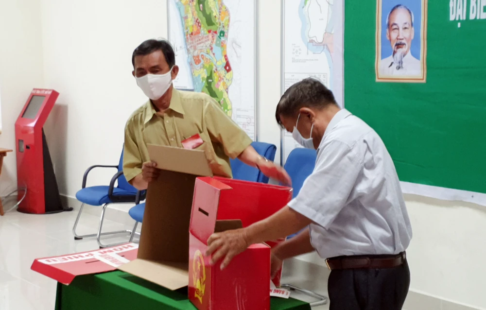 Kiểm tra các thùng phiếu để tiến hành khai mạc cho cử tri bỏ phiếu. Ảnh: CHÂU ANH