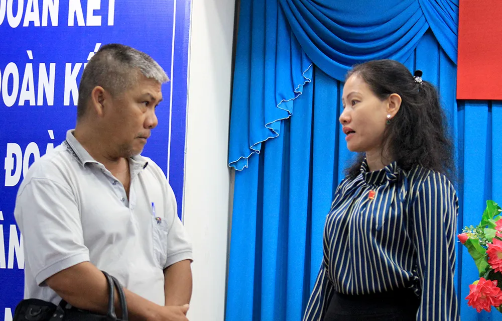 Đại biểu Quốc hội Phan Thị Bình Thuận, Phó Giám đốc Sở Tư pháp TP.HCM, đang trao đổi với cử tri quận Bình Tân. Ảnh: HƯƠNG NGUYÊN