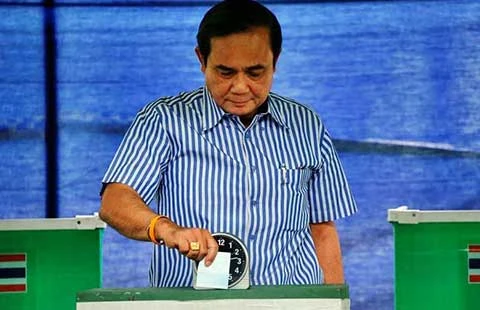 Thủ tướng Prayut Chan-o-cha bỏ phiếu tán thành dự thảo hiến pháp mới tại phòng phiếu ở Bangkok. Ảnh: REUTERS