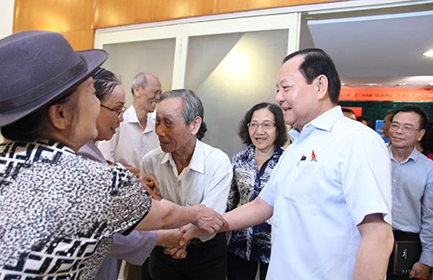 Đại biểu Quốc hội, Bí thư Thành ủy TP.HCM Lê Thanh Hải trao đổi với cử tri quận 10 sáng 30-9. Ảnh: HOÀNG GIANG