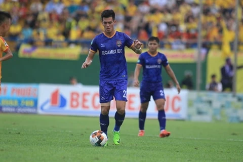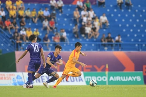 Hoàng Đình Tùng (áo vàng) cũng có những cơ hội nhưng không mang lại bàn thắng cho Thanh Hóa. Ảnh: N.T