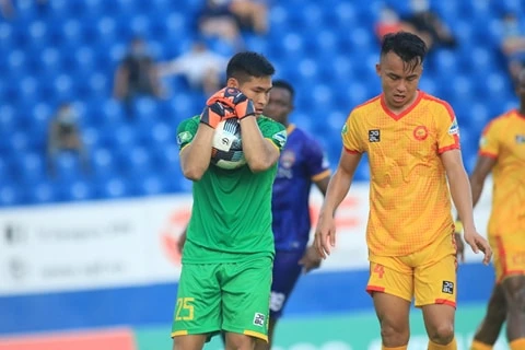 Thủ môn Thanh Diệp của Thanh Hóa xuất sắc nhưng bó tay trước pha dứt điểm của Tấn Tài. Ảnh: NGỌC TRÂM