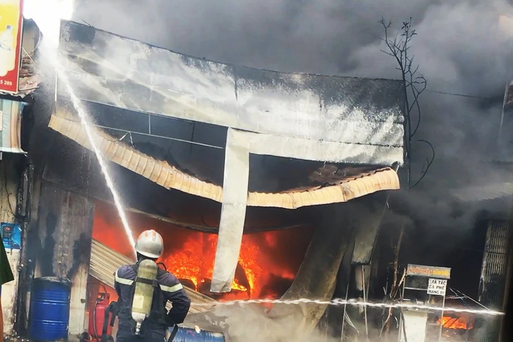 Lửa bùng lên từ cửa hàng sơn trên đường Quách Điêu và nhanh chóng bao trùm khu vực. Ảnh HT