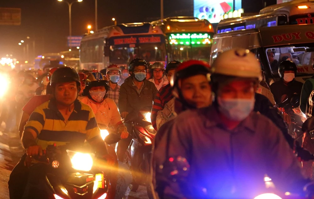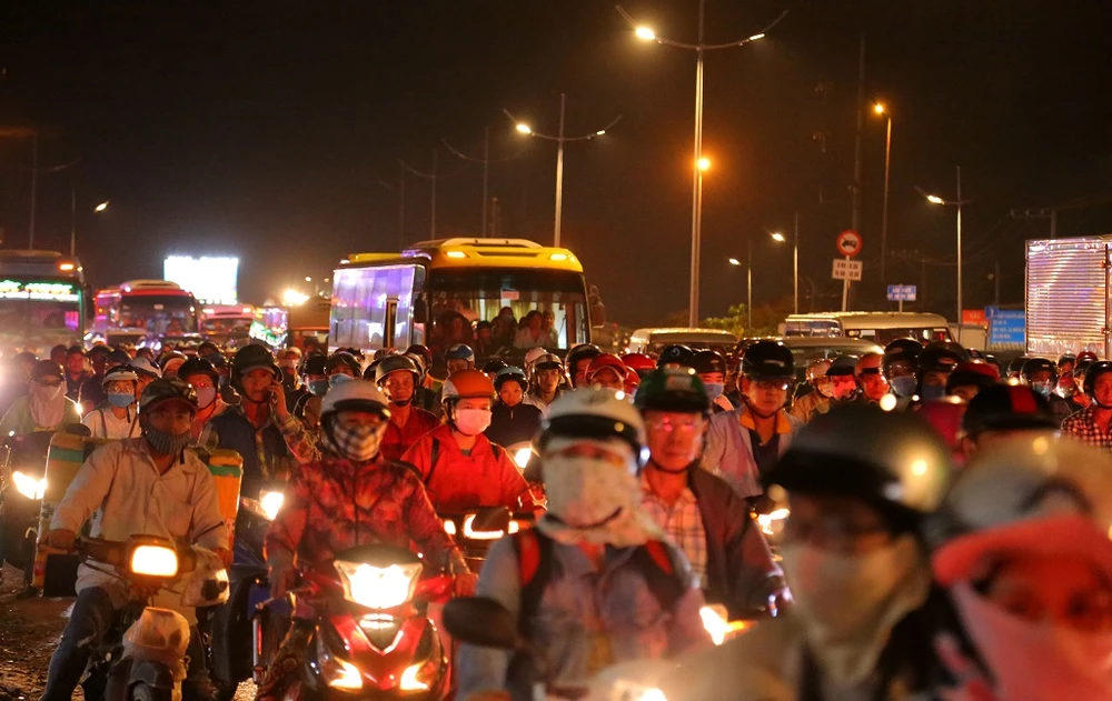 Chiều tối 1-1, cửa ngõ phía Tây TP.HCM, đoạn qua quốc lộ 1A, xã Tân Kiên, huyện Bình Chánh, hàng ngàn phương tiện đổ về trung tâm thành phố sau kì nghỉ lễ khiến giao thông khu vực này ùn tắc.