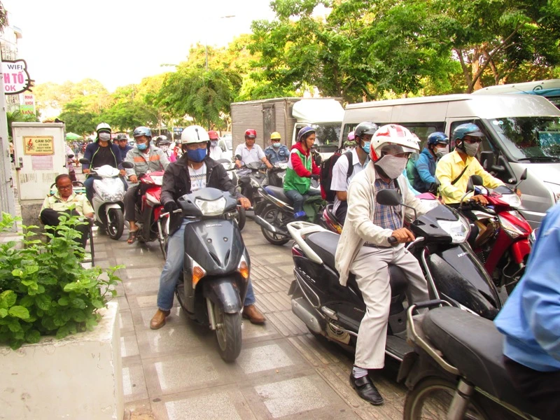 Người người chen chân, leo lên vỉa hè hòng qua chỗ kẹt xe. Ảnh: Phước Tĩnh