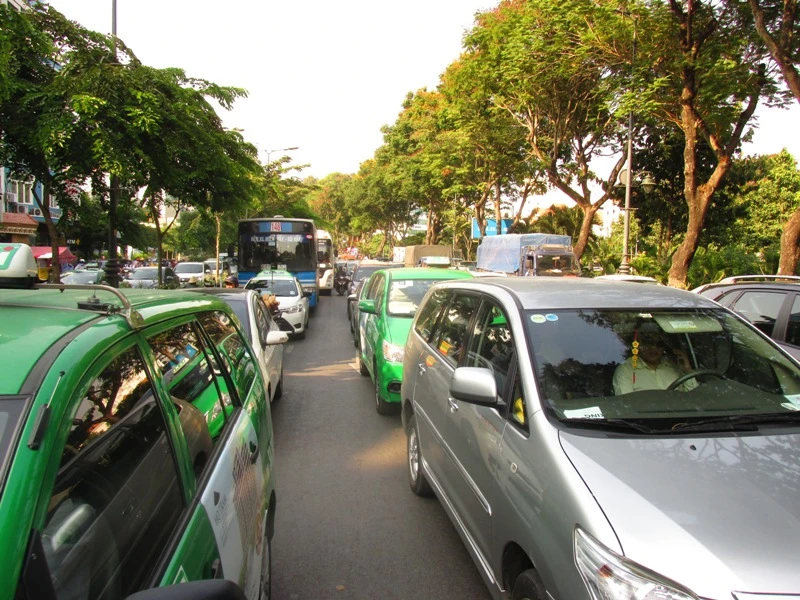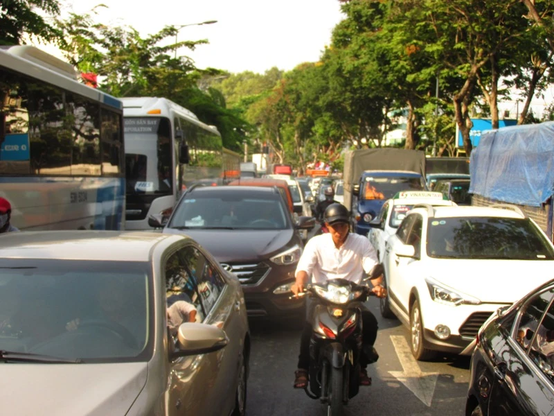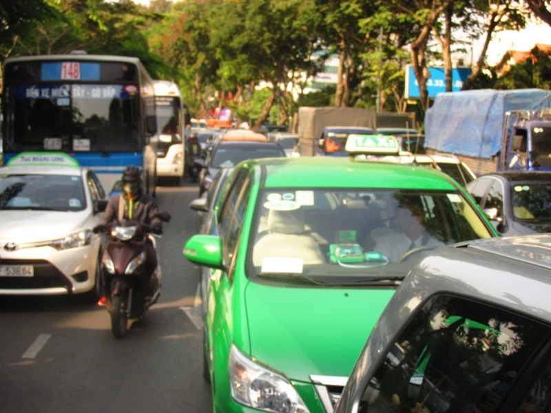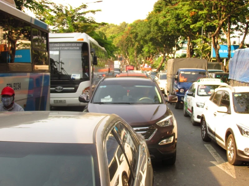 Xe cộ chen nhau trên đường Trường Sơn, khu vực cửa ngõ ra vào sân bay Tân Sơn Nhất. Ảnh: Phước Tĩnh