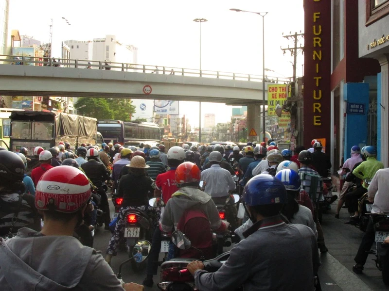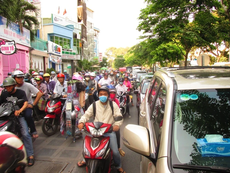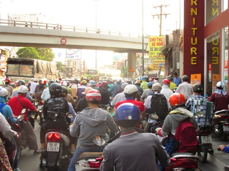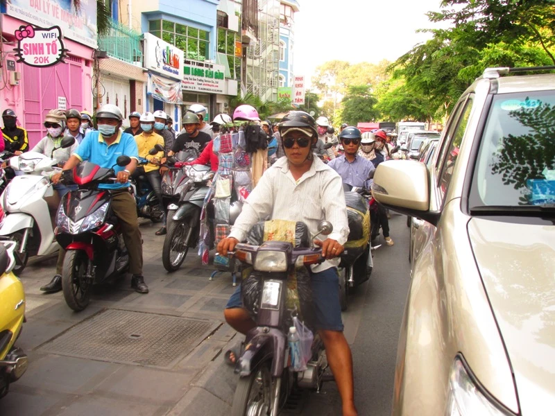 Xe cộ chen chân nhau đến khu vực cầu vượt Lăng Cha Cả. Nhiều đội CSGT đã cố gắng điều tiết nhưng lượng xe mỗi lúc một đông. Hàng trăm xe máy đã phải leo lên vỉa hè để tranh nhau qua chỗ kẹt.