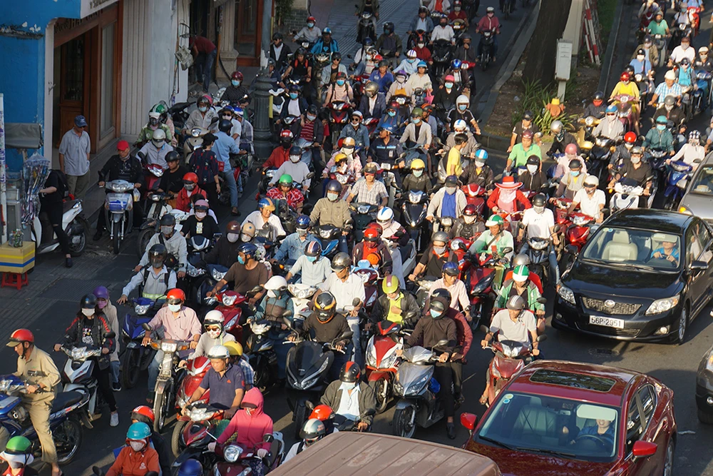 Các phương tiện như xe máy phải khá vất vả len lỏi giữa dòng xe ô tô đông đúc.