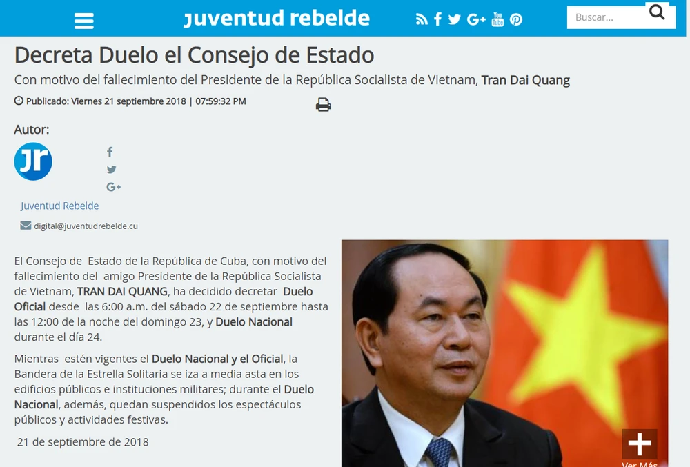 Báo Juventud Rebele của Đoàn Thanh niên Cộng sản Cuba đăng tin về việc tổ chức quốc tang tưởng nhớ Chủ tịch nước Việt Nam Trần Đại Quang.