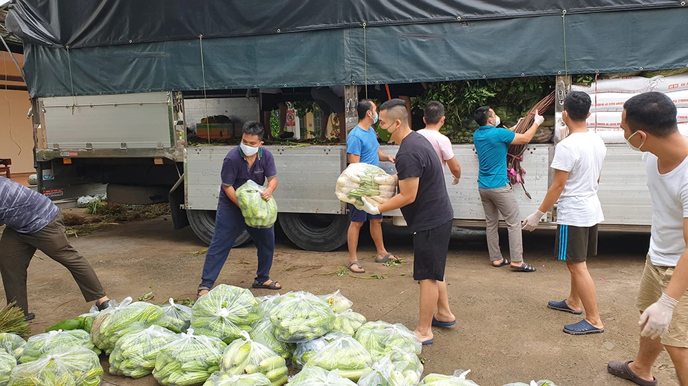 Đại diện Cục An ninh Nội địa, Bộ Công an trao tặng hàng tấn rau củ, gạo cho Bệnh viện dã chiến. Ảnh: NT