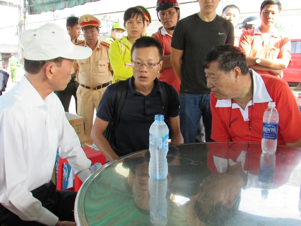 Chủ tịch TP Cần Thơ Võ Thành Thống trao đổi phương án đưa hàng ra ngoài với giám đốc công ty (áo đỏ) và đại diện hãng bảo hiểm (áo đen). Ảnh: N.NAM