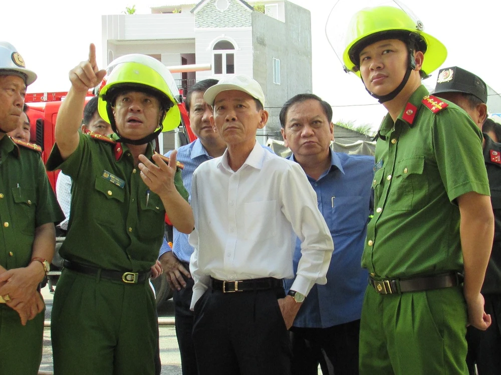 Bí thư Thành ủy Trần Quốc Trung (áo xanh hàng sau) và Chủ tịch TP Võ Thành Thống (áo trắng) nghe lực lượng chức năng trình bày phương án tiếp cận đưa hàng ra khỏi khu vực cháy. Ảnh: N.NAM
