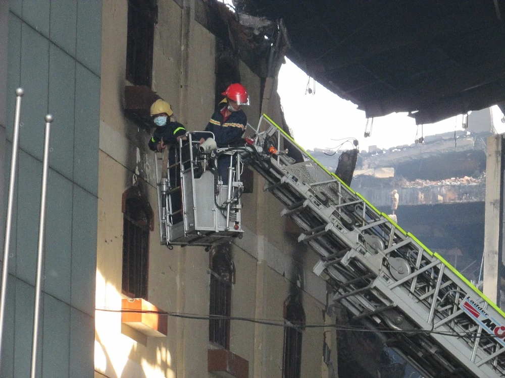 Sáng 27-3, lực lượng PCCC kiểm tra các khu vực bị cháy trước đó. Ảnh: N.NAM
