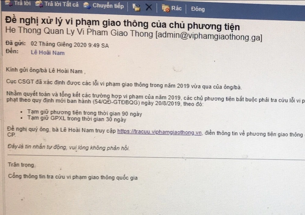Trong email, họ đã lấy danh nghĩa Cục CSGT, Cổng thông tin tra cứu vi phạm giao thông quốc gia để thông báo các lỗi vi phạm giao thông. Người gửi email yêu cầu phía nhận truy cập vào một trang web để cung cấp thông tin phương tiện giao thông, đóng tiền phạt.