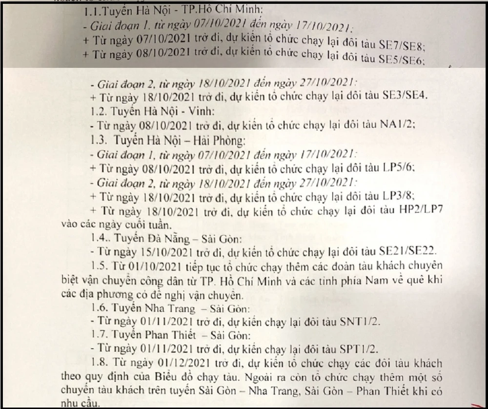 Trong văn bản, Cục Đường sắt Việt Nam cho biết do ảnh hưởng của dịch COVID-19, từ cuối tháng 8-2021, nhiều địa phương thực hiện giãn cách xã hội theo Chỉ thị số 16 đã dừng chạy tàu khách trên tất cả các chuyến.