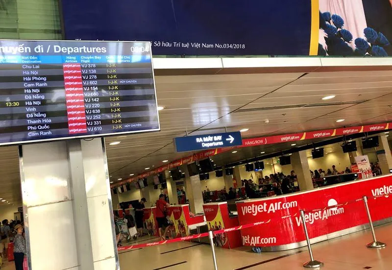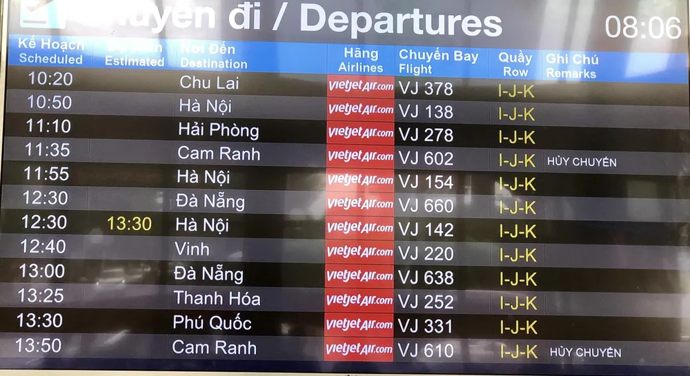 Bảng điện tử cập nhật thông tin các chuyến bay khởi từ TP.HCM của Vietjet tính đến 13 giờ 50 khá dày đặc, bình quân 25-40 phút có một chuyến. Đáng chú ý bảng điện tử cũng hiển thị 3 chuyến bay bị hủy gồm: chuyến bay VJ214 lúc 9 giờ 10 đi Vinh; chuyến bay VJ602 đi Cam Ranh lúc 11 giờ 35 và chuyến bay VJ610 đi Canh Ranh lúc 13 giờ 50.