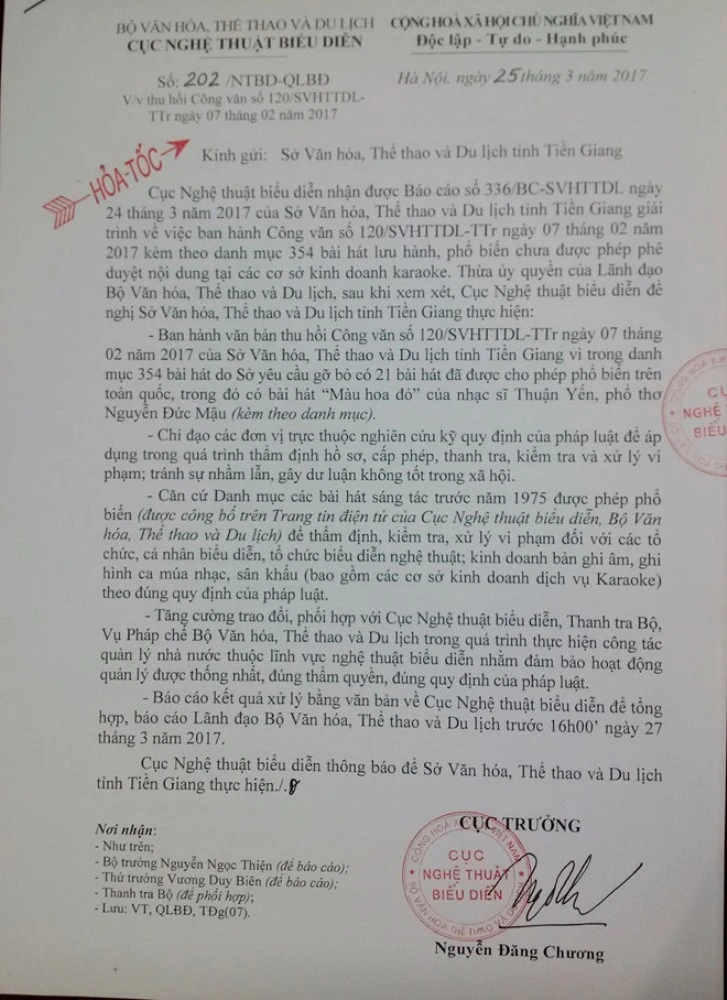 Theo đó, Cục đề nghị Sở Văn hóa - Thể thao và Du lịch Tiền Giang thu hồi công văn ngày 7-2 vì trong danh mục 354 bài hát Sở yêu cầu gỡ bỏ có 21 bài hát đã được cho phép phổ biến trên toàn quốc, trong đó có bài hát Màu hoa đỏ của nhạc sĩ Thuận Yến, phổ thơ Nguyễn Đức Mậu.