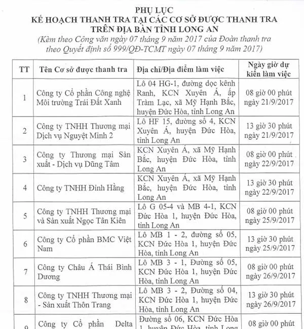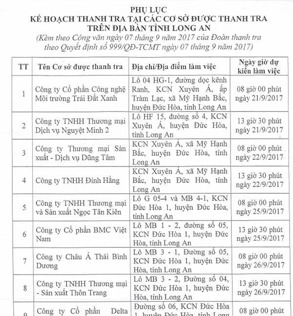 Như chúng tôi đã thông tin, theo kế hoạch, ông Quang làm trưởng đoàn, thanh tra 30 đơn vị, doanh nghiệp trên địa bàn tỉnh Long An theo phân công của Bộ TN&MT.