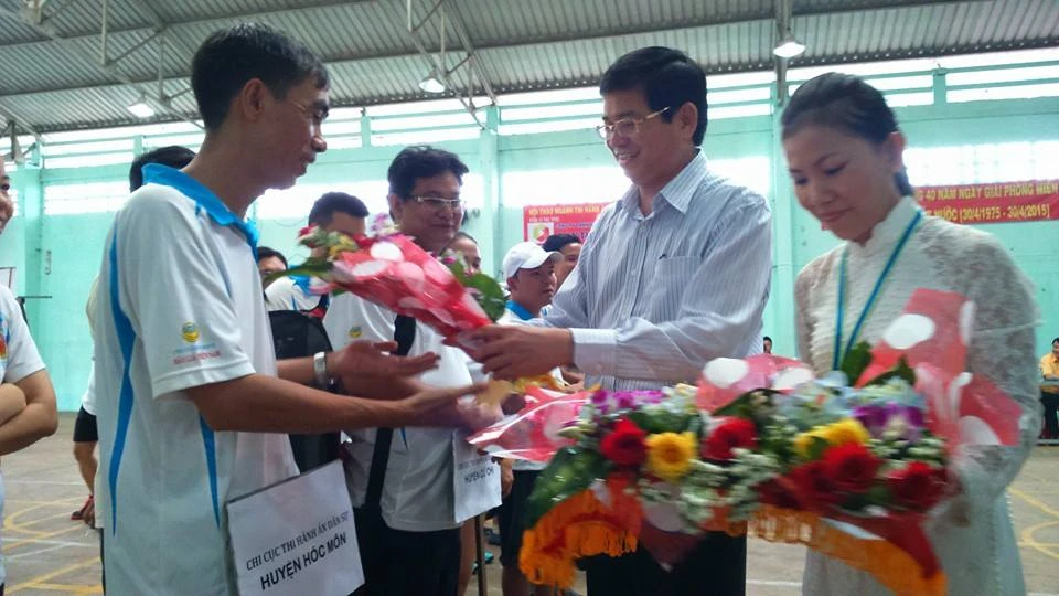 Lãnh đạo Cục THA Dân sự TP.HCM trao hoa và cờ lưu niệm cho các vận động viên.
