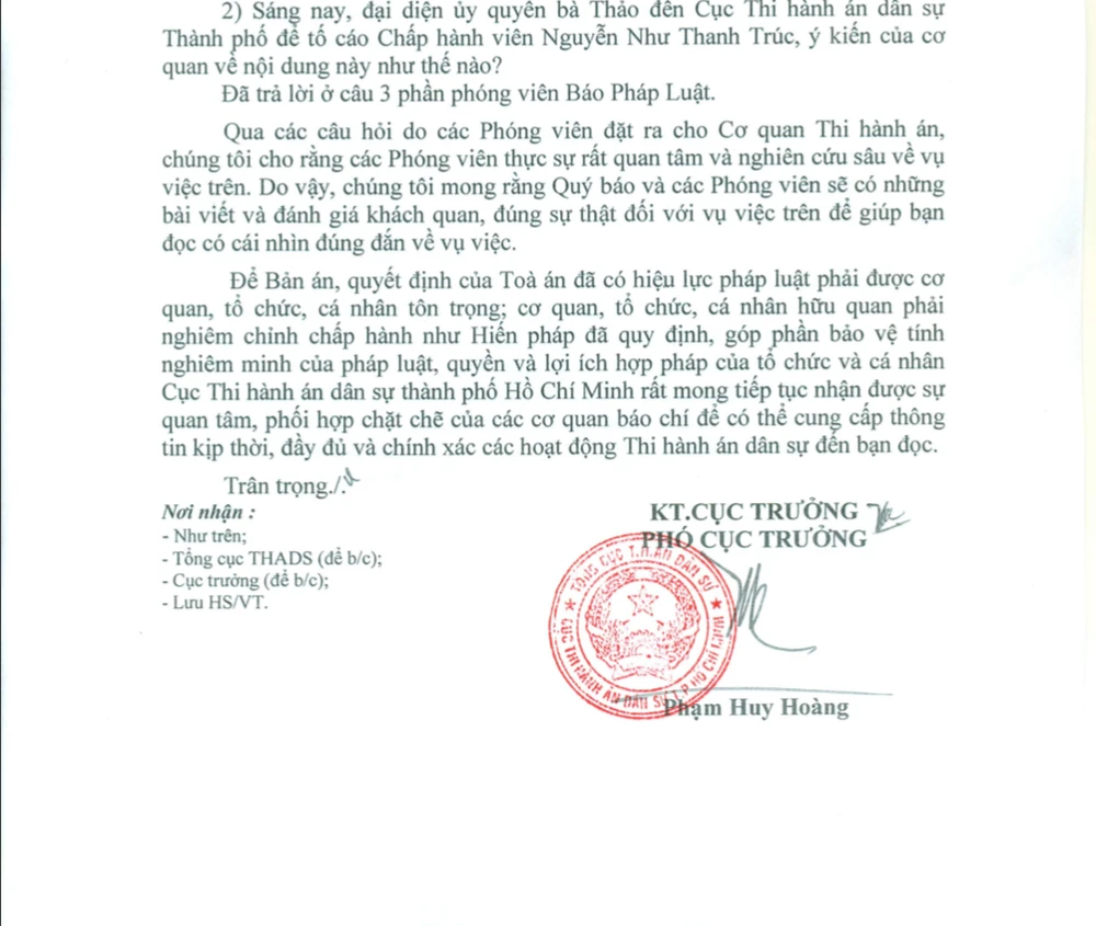 Công văn Cục THADS TP.HCM trả lời phóng viên báo Pháp Luật TP.HCM