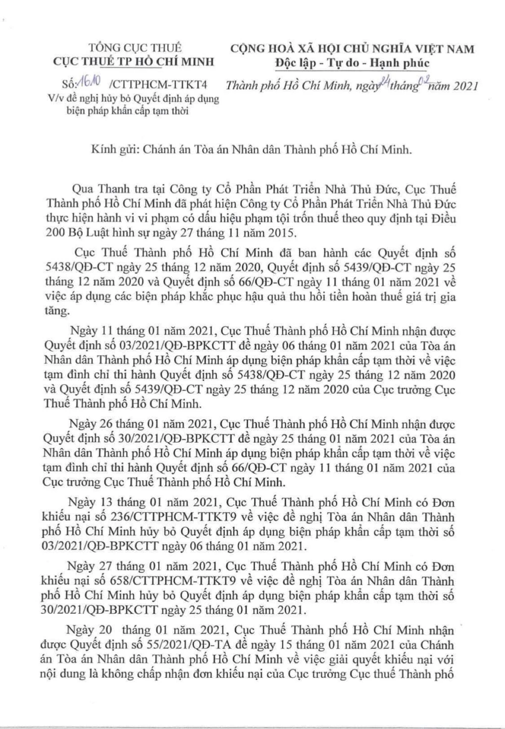 Cục thuế TP.HCM vừa gửi văn bản đến Chánh án TAND TP.HCM đề nghị hủy bỏ quyết định áp dụng biện pháp khẩn cấp tạm thời liên quan đến Công ty cổ phần Phát triển nhà Thủ Đức.