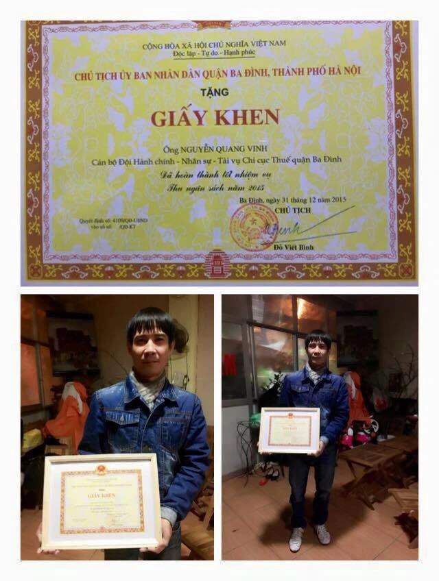 Ngoài ra, ngày 29-2, trên mạng xã hội xuất hiện hình ảnh ông Vinh cầm tấm giấy khen với nội dung: “Giấy khen ông Nguyễn Quang Vinh, cán bộ Đội thi hành - Nhân sự - Tài vụ Chi cục Thuế quận Ba Đình vì đã hoàn thành tốt nhiệm vụ thu ngân sách năm 2015”, gây xôn xao cộng đồng mạng.