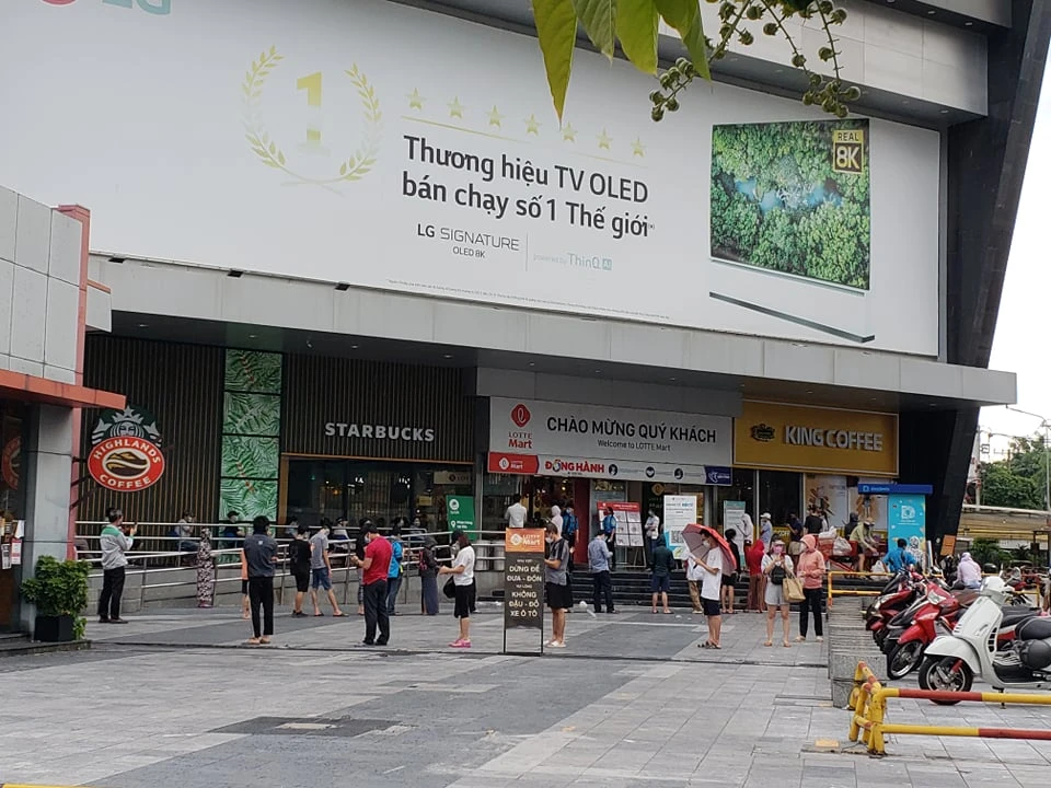 Người dân xếp hàng dài chờ vào mua hàng tại siêu thị Lotte Mart trên đường Cộng Hoà. Ảnh: TS