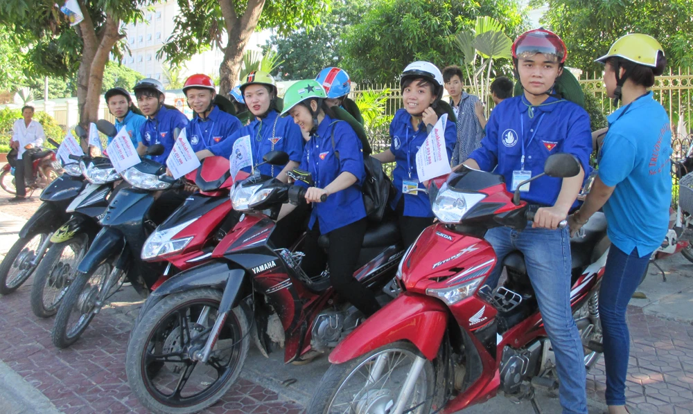 Đội sinh viên tình nguyện Trường ĐH Vinh có xe ôm đưa rước thí sinh đi thi miễn phí. Ảnh: ĐẮC LAM