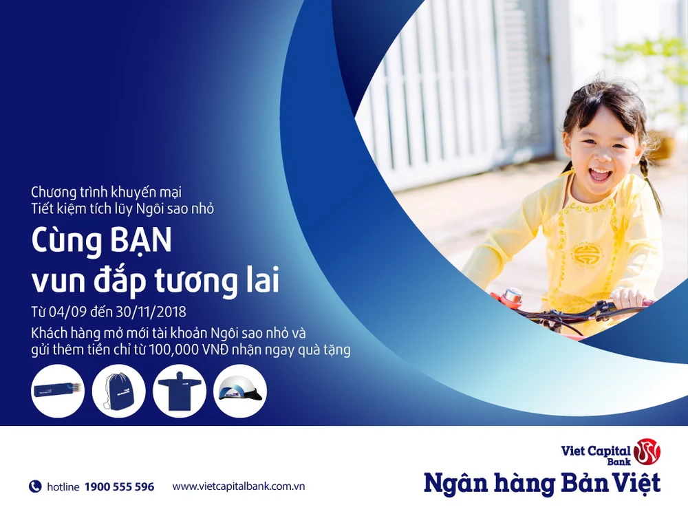 Để cùng các bậc phụ huynh chuẩn bị nguồn tài chính tốt cho tương lai, giáo dục các bé tiết kiệm ngay từ nhỏ và mang đến nhiều niềm vui nhân dịp năm học mới, Ngân hàng Bản Việt triển khai chương trình khuyến mãi Tiết kiệm tích lũy Ngôi sao nhỏ: “Cùng BẠN vun đắp tương lai”. Chương trình dành những phần quà xinh xắn cho bé: Áo mưa trẻ em, nón bảo hiểm trẻ em, ba lô tiện dụng, bút chì...