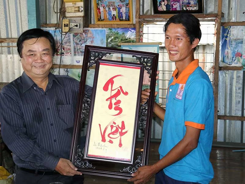 Bí thư Đồng Tháp Lê Minh Hoan chúc mừng anh Võ Văn Tiếng khởi nghiệp với giống lúa sạch ở Hồng Ngự. Ảnh: VVT
