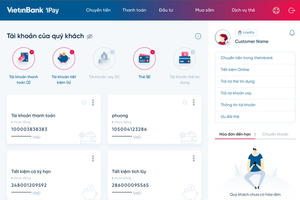 Các giao dịch tài chính, thanh toán và mua sắm đều dễ dàng thực hiện với VietinBank iPay Web. Một số tính năng nổi bật đã được phiên bản Web mới đồng bộ với phiên bản Mobile có thể kể đến như: Thanh toán hóa đơn bằng thẻ tín dụng, kích hoạt/khóa thẻ, đăng ký các dịch vụ thẻ, đặt lịch thanh toán hóa đơn, nhắc nợ thanh toán hóa đơn, chuyển khoản chứng khoán, chuyển tiền theo lịch (trong VietinBank và ngoài hệ thống), Loyalty, đặt mua vé máy bay, mua sắm VNShop… Bên cạnh đó, VietinBank iPay Web còn cung cấp giải pháp xác thực Soft OTP và FacePay hiện đại, bảo mật hàng đầu cho các giao dịch tài chính giá trị cao.