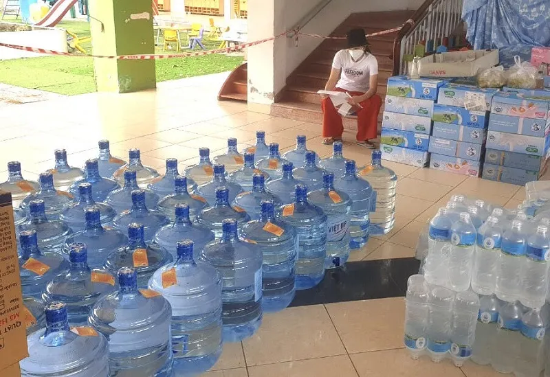 Hàng trăm bình nước của chương trình đã chuyển đến các điểm phong tỏa. Nước tập kết tại trụ sở UBND phường Hiệp Bình Chánh, TP Thủ Đức trước khi chuyển cho bà con đang bị phong tỏa ở khu phố 8. Ảnh: H.LIÊN