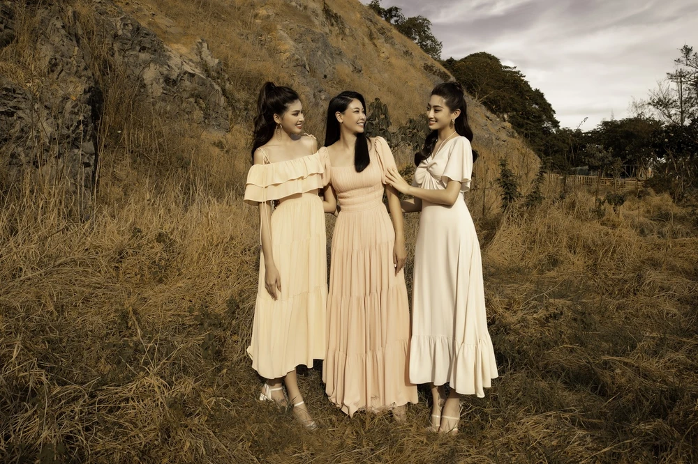 Diện thiết kế đầm maxi nữ tính, bộ ba chị em mỹ nhân trông như những nữ thần với diện mạo quý phái.