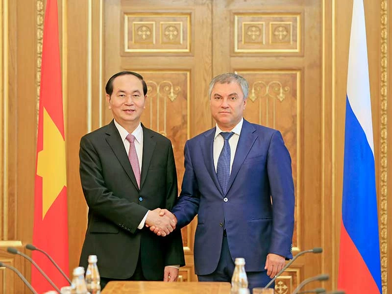 Chủ tịch nước Trần Đại Quang hội kiến với Chủ tịch Duma Quốc gia Liên bang Nga V. Volodin. Ảnh: TTXVN