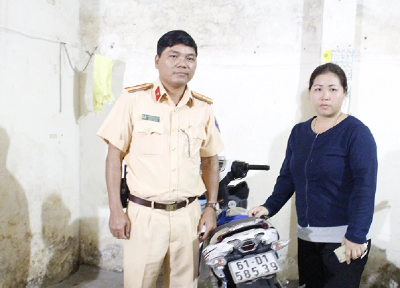 Thiếu tá Nguyễn Quang Minh trực tiếp bàn giao tang vật cho chị Hàn Thị Ngọc, chủ phương tiện.