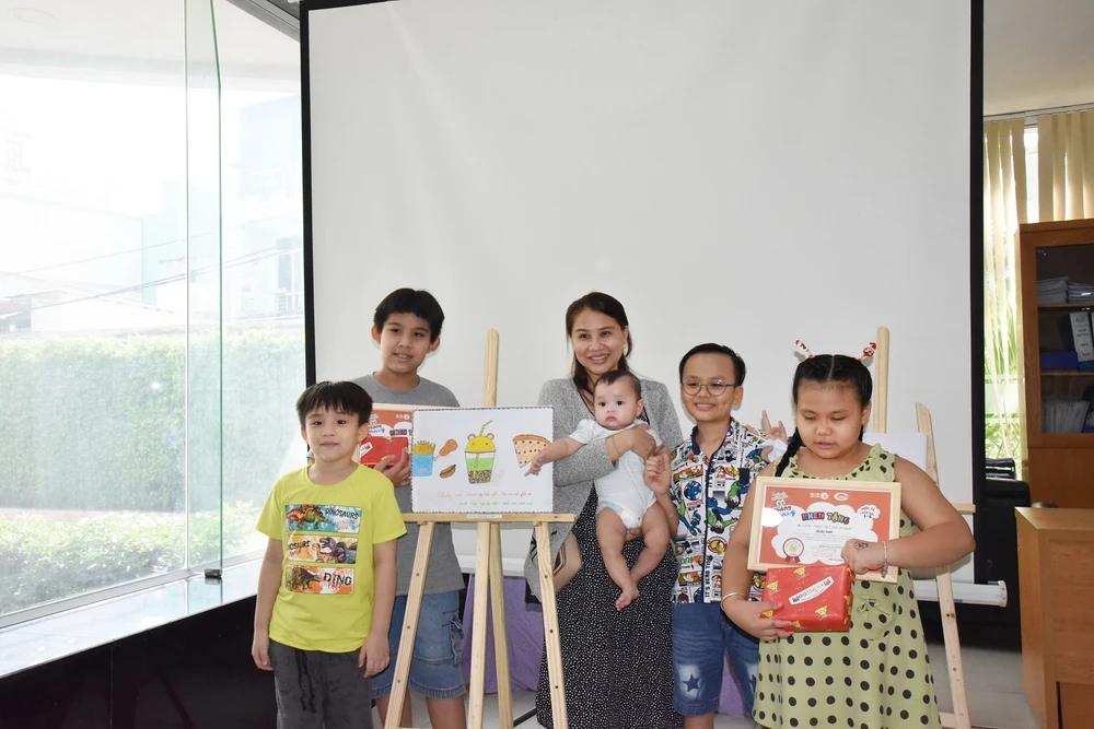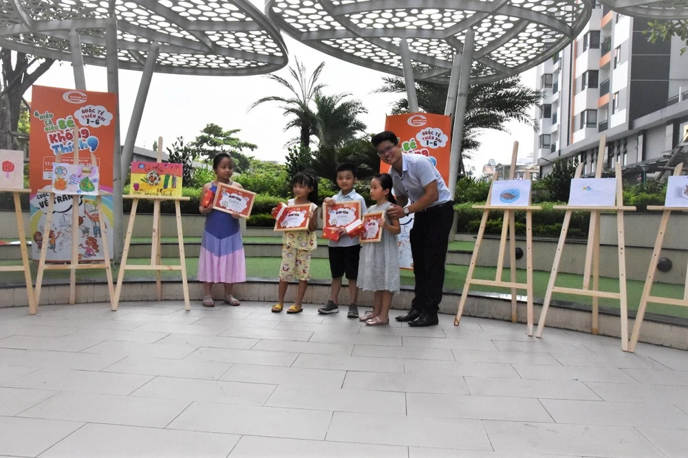 Đại diện BTC trao thưởng cho các cư dân nhí đoạt giải cuộc thi “Vẽ về món ăn con không thích”.