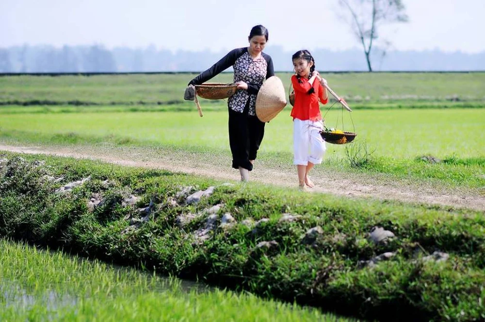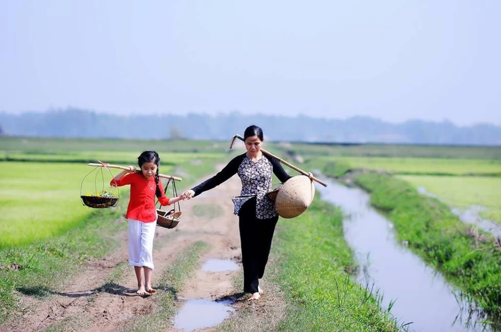 Bức hình "mẹ gánh con ra đồng" của chị Nguyễn Thị Liên khiến ai xem cũng thích thú