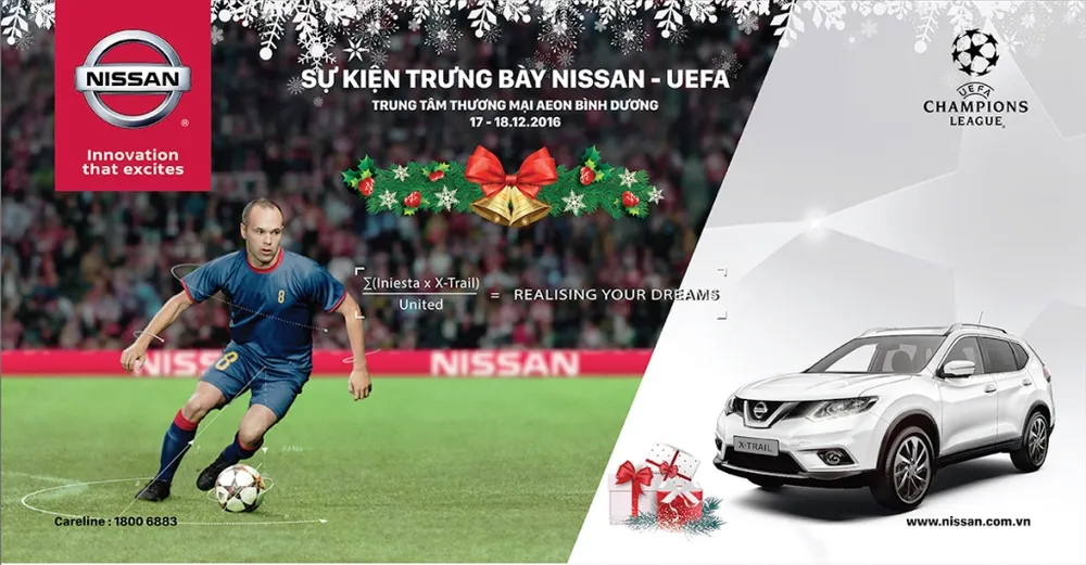 Với mong muốn đem lại không khí mùa Giáng Sinh rộn ràng nhất cho tất cả khách hàng, chuỗi hành trình sự kiện Nissan UEFA sẽ tiếp tục được thực hiện ở ba thành phố lớn Hà Nội, Thành phố Hồ Chí Minh và Bình Dương trong các ngày cuối tuần 17,18/12/2016 và 24,25/12/2016 với nhiều hoạt động đa dạng như: trưng bày – trải nghiệm lái thử xe, tham gia các hoạt động giải trí tương tác mang đậm không khí bóng đá UEFA (game PS4, mini football, lucky money,...)
