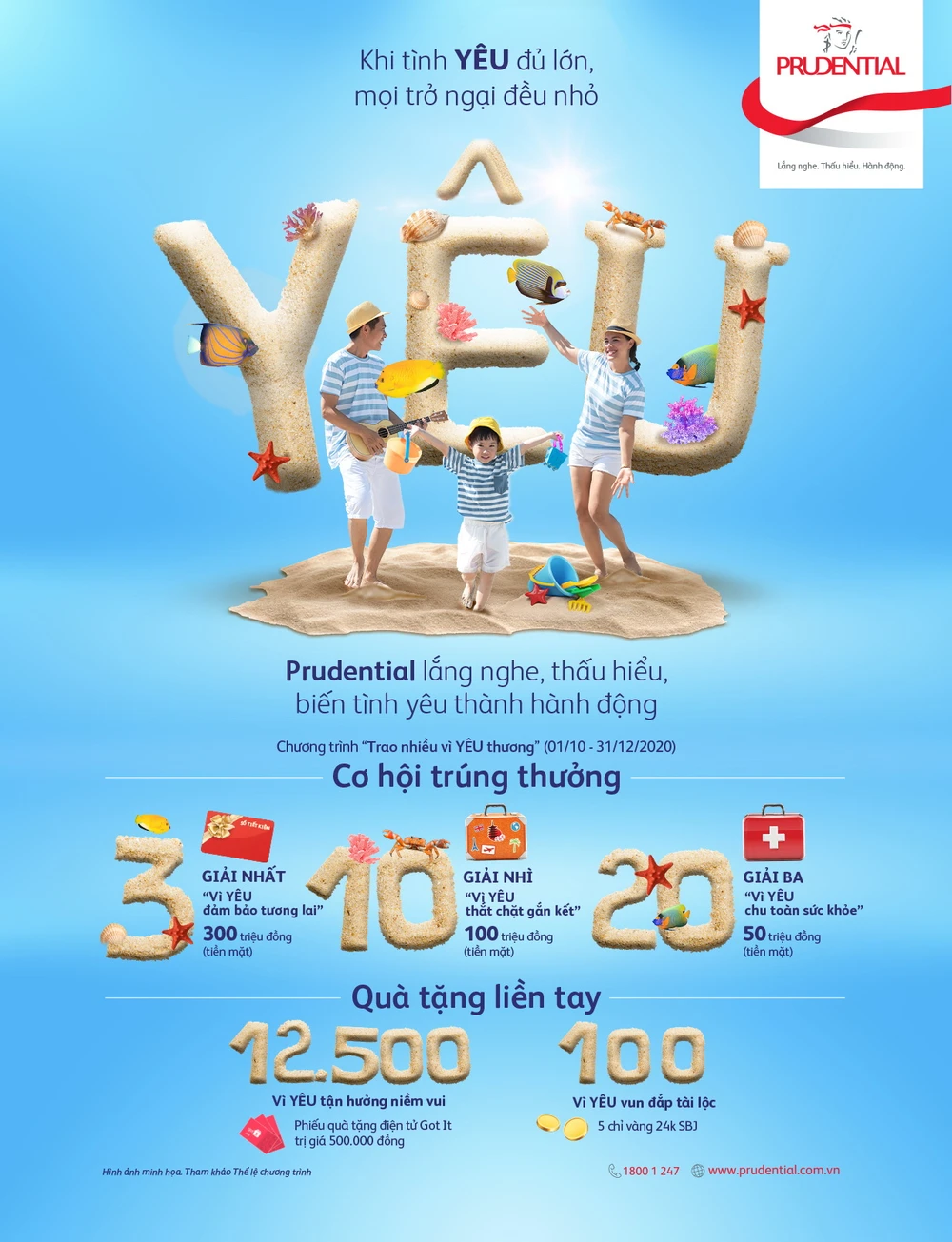 Nằm trong chiến dịch “Khi tình yêu đủ lớn” của Prudential Việt Nam, chương trình khuyến mại “Trao nhiều vì yêu thương” được triển khai với mong muốn lan tỏa tinh thần hãy vìYÊU mà hãy “hành động” để vun đắp tình yêu ngày càng lớn hơn nữa.