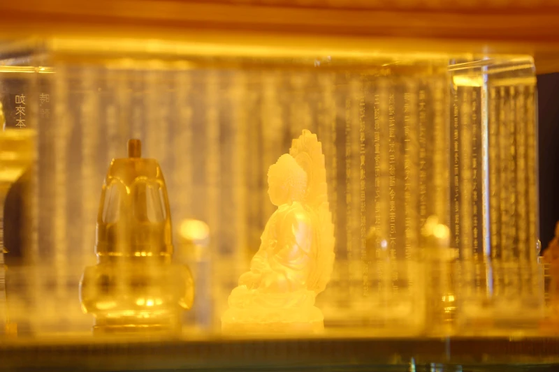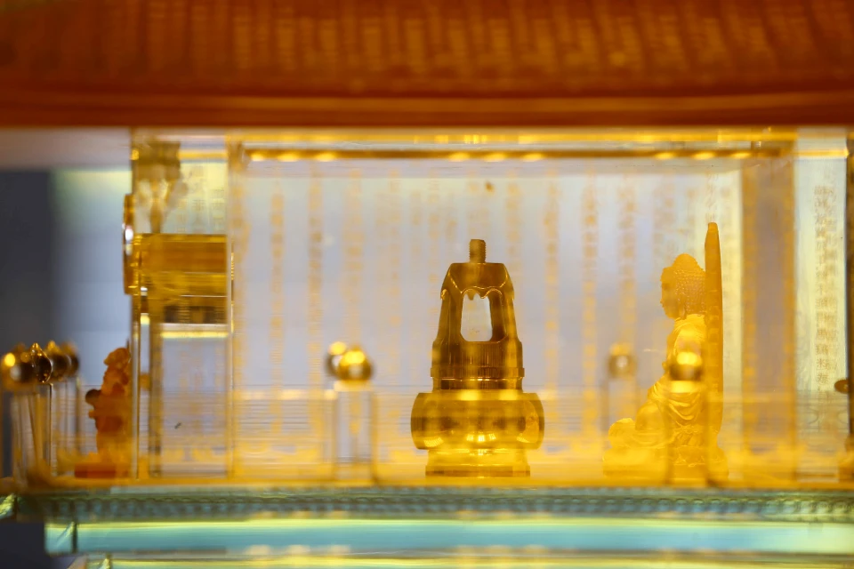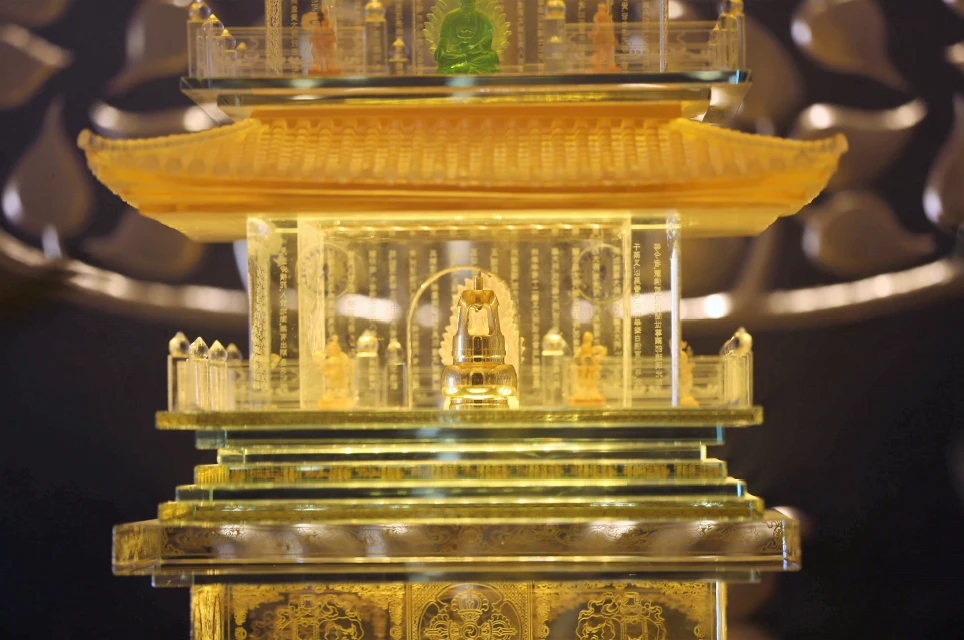 Ngọc Xá lợi Phật được cất giữ trong tháp đồng nhỏ, đặt trang trọng trong tháp pha lê lưu ly 7 tầng, tỏa sáng lung linh giữa không gian trang nghiêm mà lộng lẫy trong lòng Đại tượng Phật A Di Đà ở độ cao 3.000m
