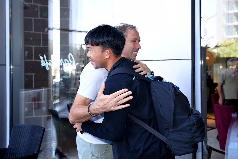 Rajevac ôm chầm thủ môn Kawin (đang chấn thương)