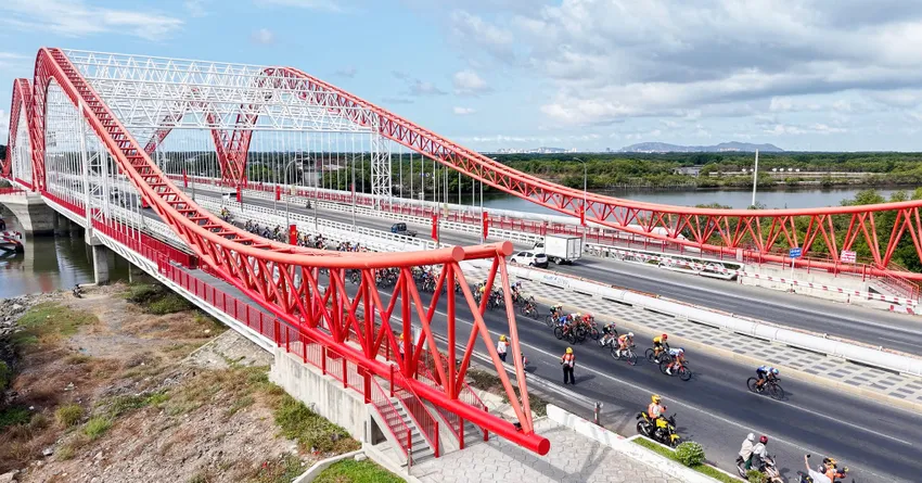 Đoàn đua tăng tốc qua cầu Cỏ Mây - Vũng Tàu. Ảnh: PHẠM HUY