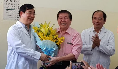 Một bệnh nhân COVID-19 (giữa) đã được BV Bệnh nhiệt đới TP.HCM chữa khỏi. Ảnh: TRẦN NGỌC